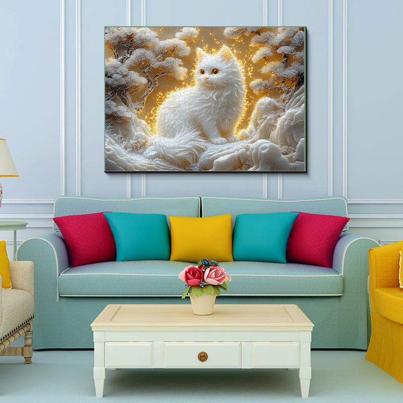 Warm Color Palette Contrast: The golden background and glowing light create a warm contrast with the cool, white tones of the cat, trees, and landscape, resulting in a visually harmonious and captivating composition.