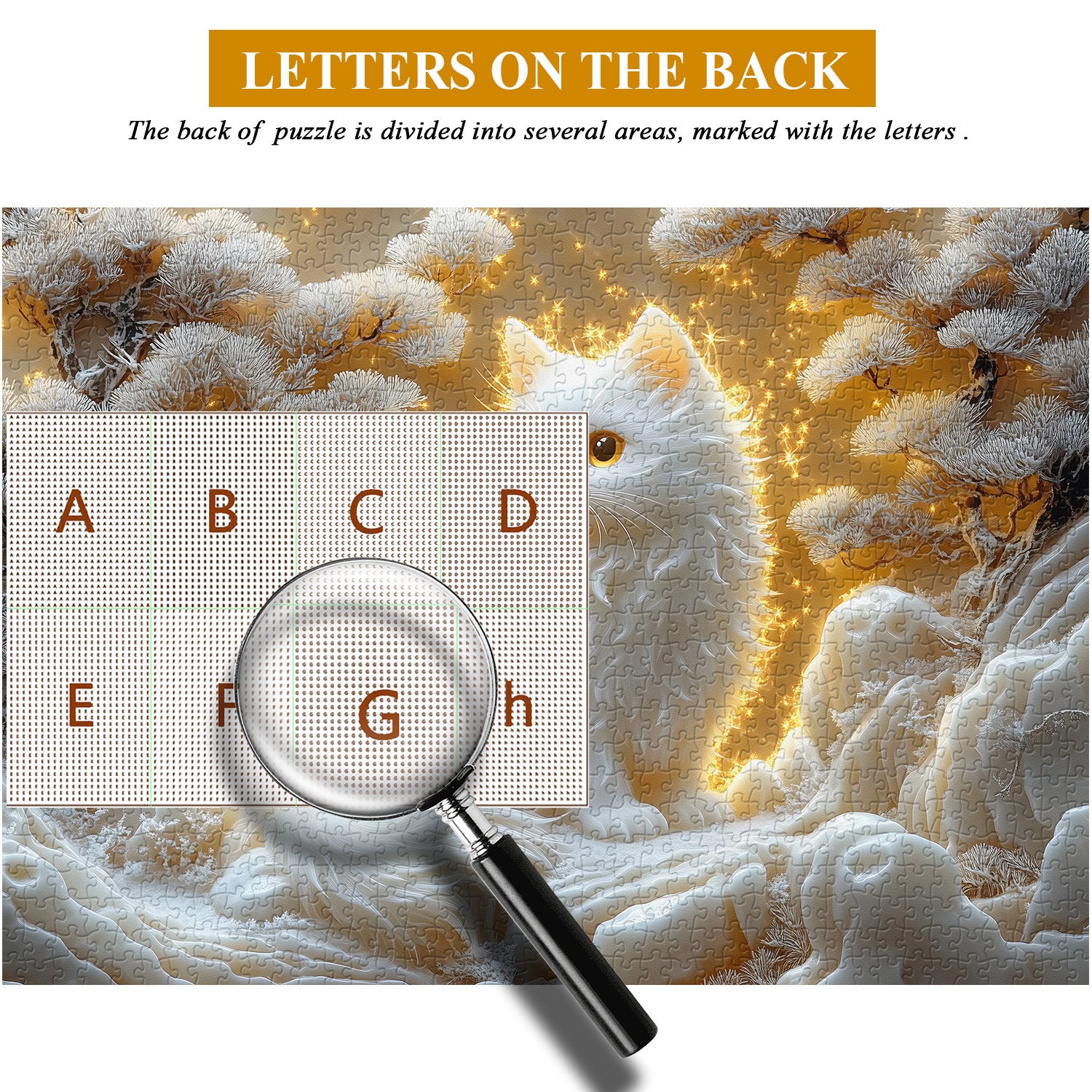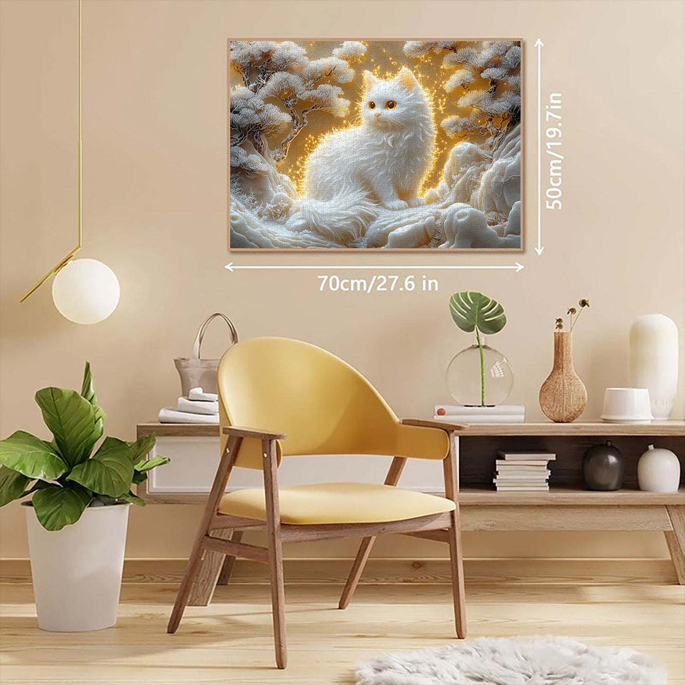 Enchanting White Cat: The central figure is a fluffy white cat with large, luminous golden eyes, its fur detailed with soft textures and a glowing aura that makes it the focal point.