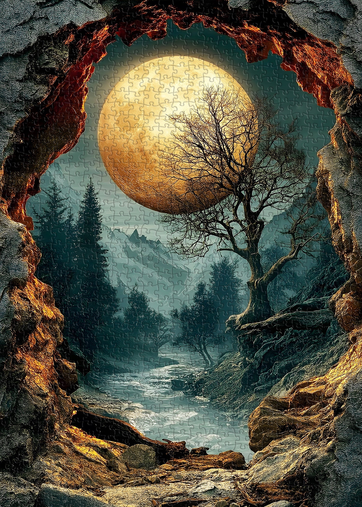 Cave Entrance: A rugged cave entrance frames the scene, with its edges glowing in warm, fiery hues that contrast with the cool tones of the landscape beyond.