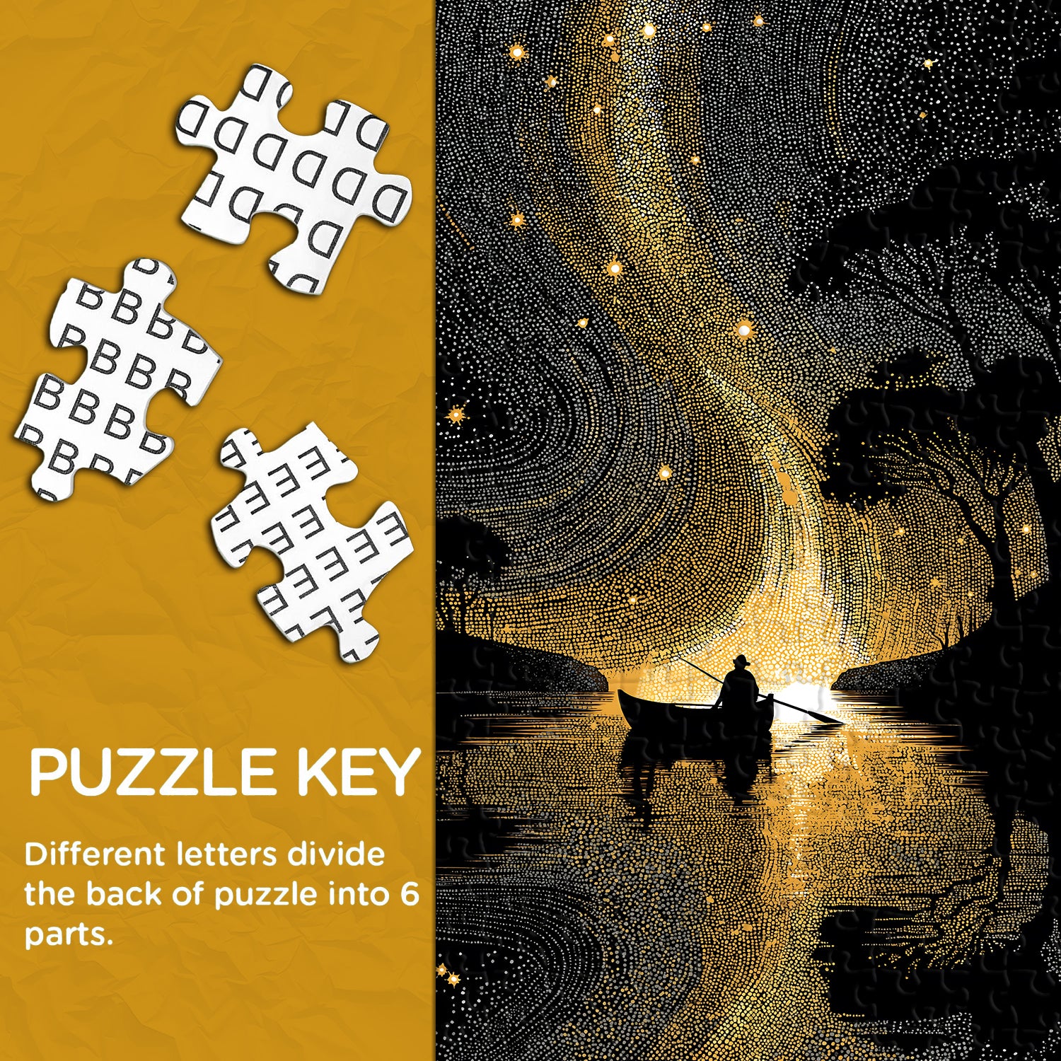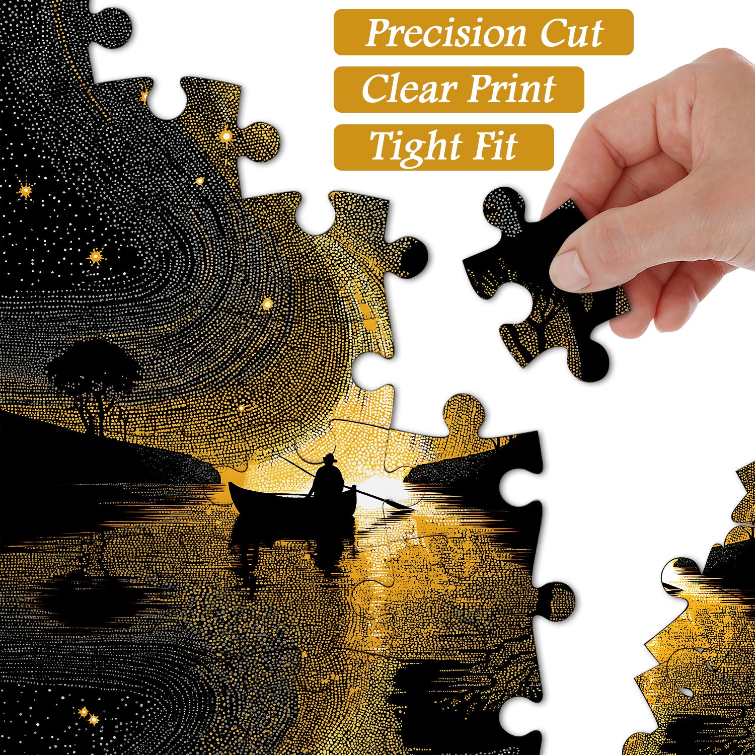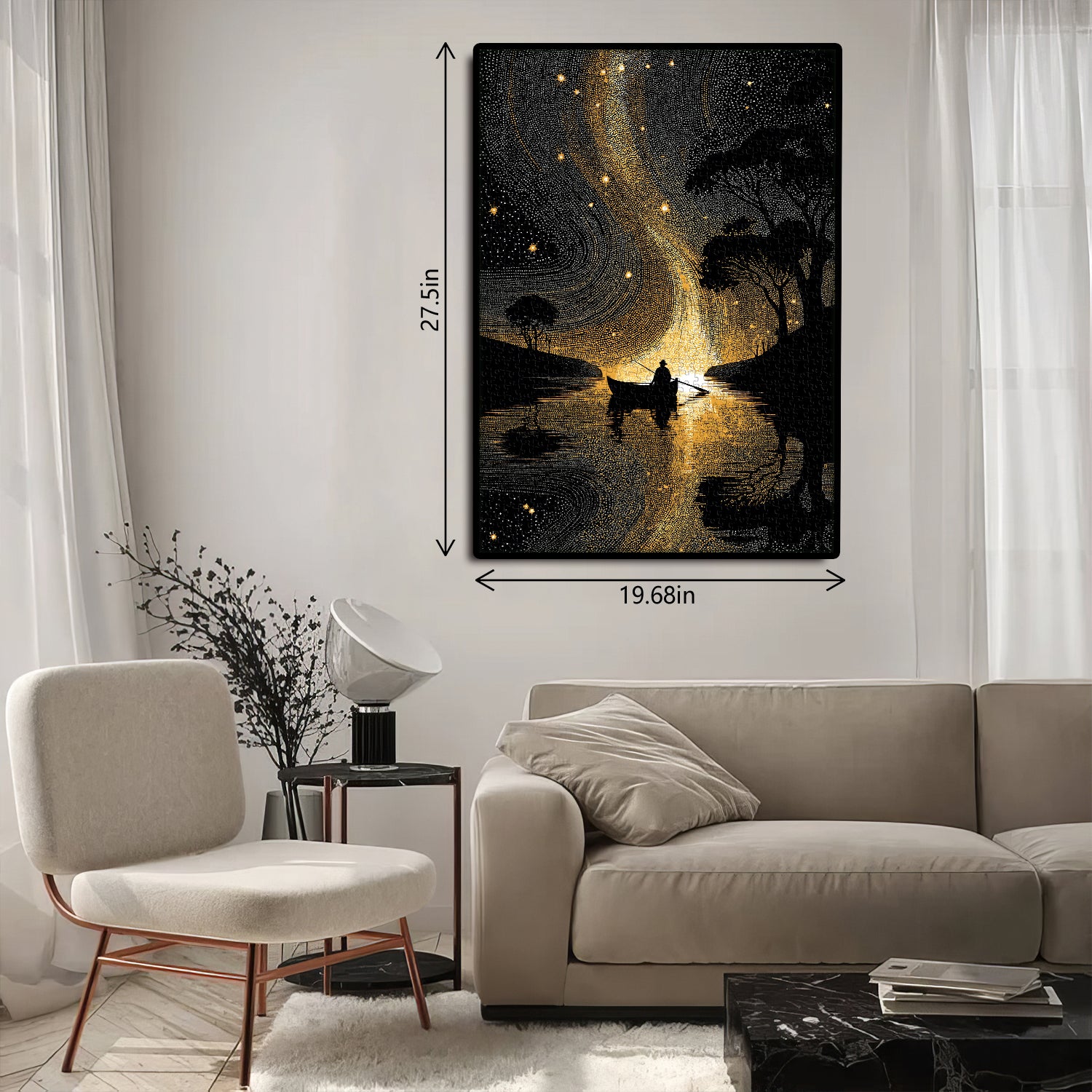 Artistic Style: Striking black-and-gold pointillism design featuring a swirling cosmic starscape and serene lakeside silhouette, creating a modern, eye-catching aesthetic.