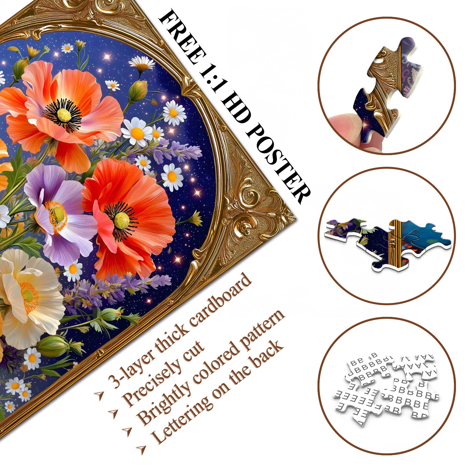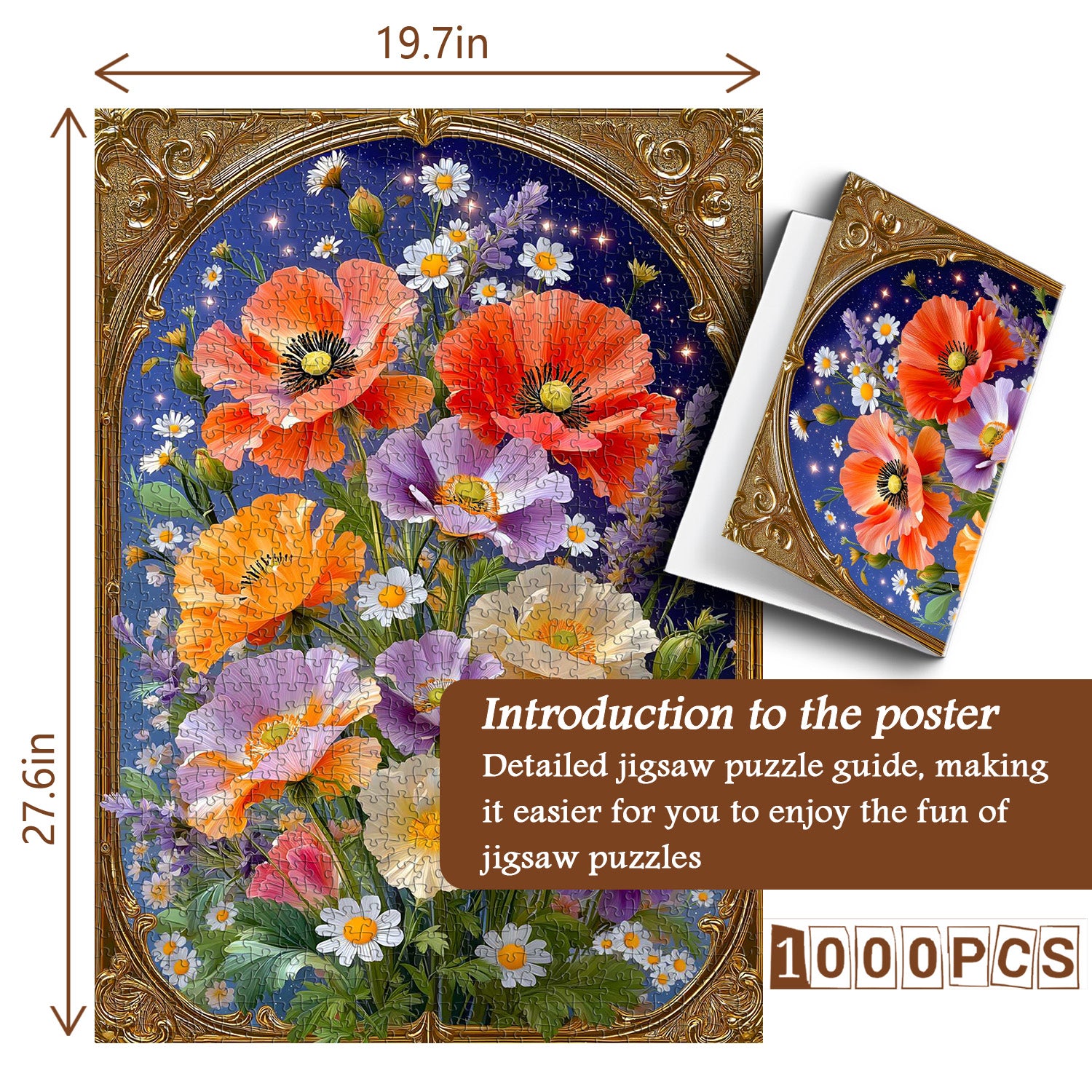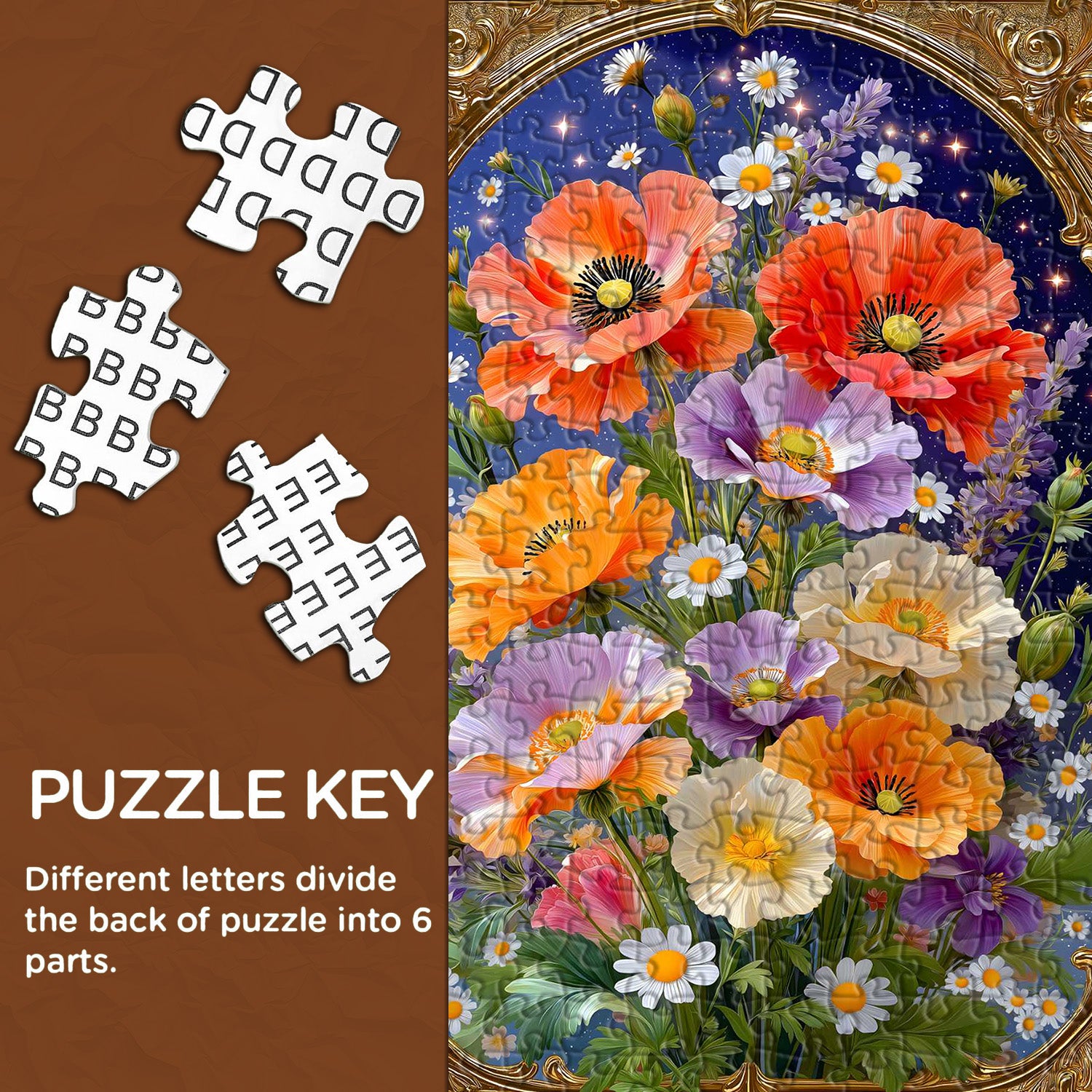Artistic Theme & Floral Details:Centered on the "Golden Frame Florals" concept, this puzzle showcases vibrant Corn Poppies (in warm orange, soft purple, and creamy white) paired with delicate daisies, all set against a starry dark blue backdrop—enclosed in an ornate vintage golden frame, the realistic petal textures and sparkling star accents create an elegant, romantic atmosphere.