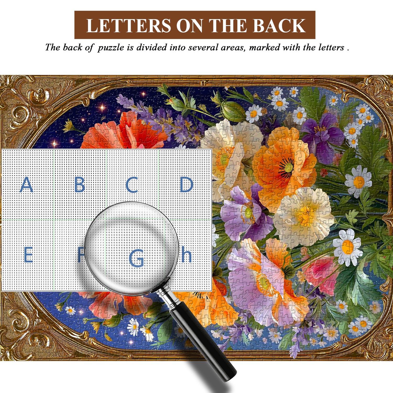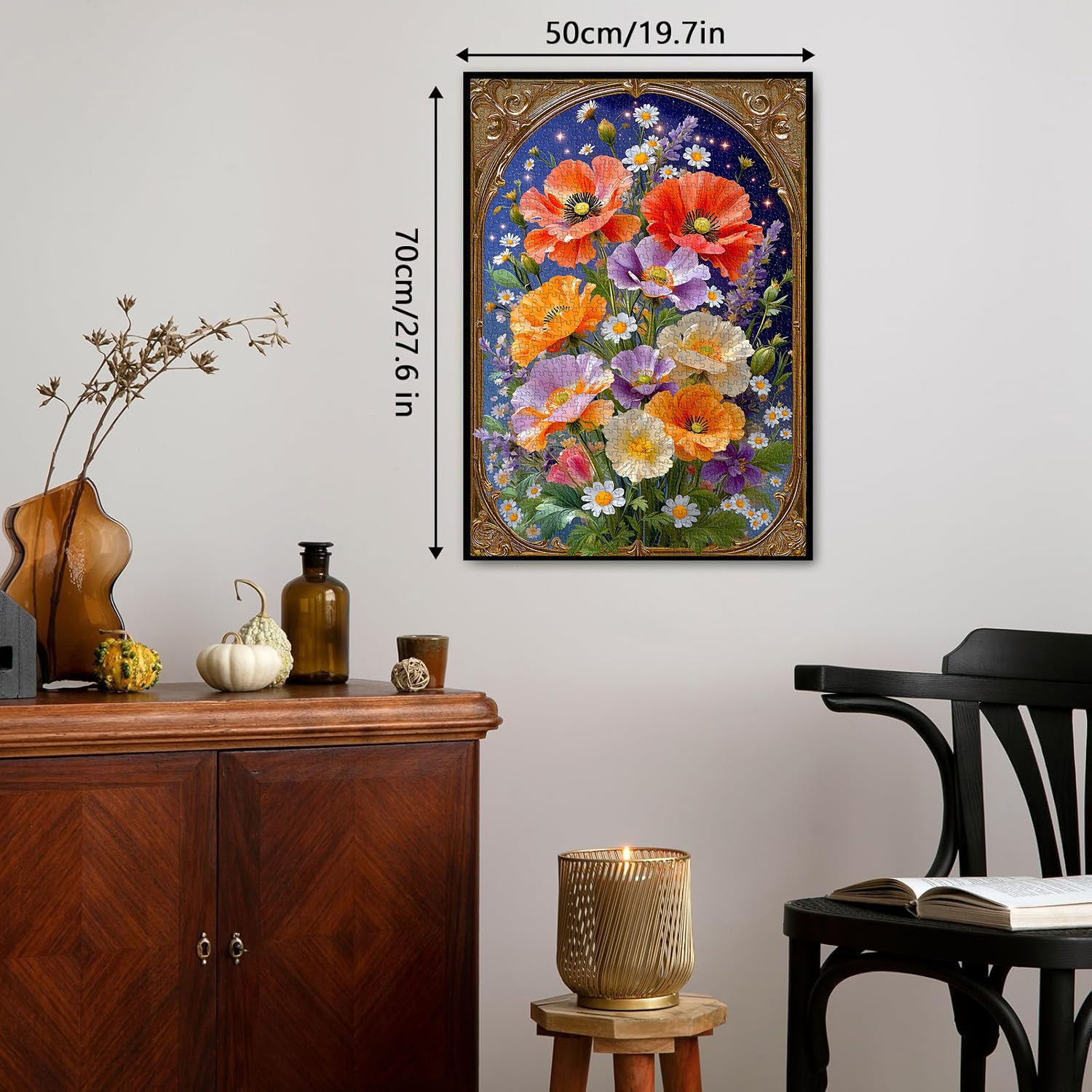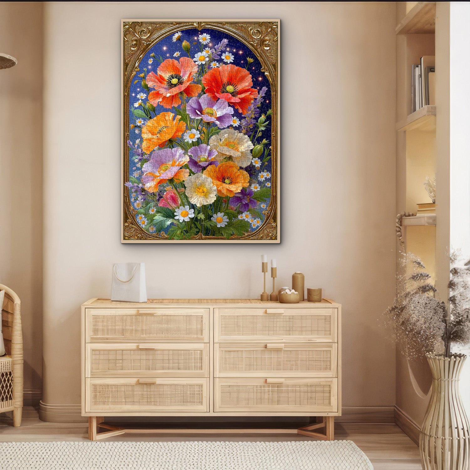 Artistic Theme & Floral Details:Centered on the "Golden Frame Florals" concept, this puzzle showcases vibrant Corn Poppies (in warm orange, soft purple, and creamy white) paired with delicate daisies, all set against a starry dark blue backdrop—enclosed in an ornate vintage golden frame, the realistic petal textures and sparkling star accents create an elegant, romantic atmosphere.
