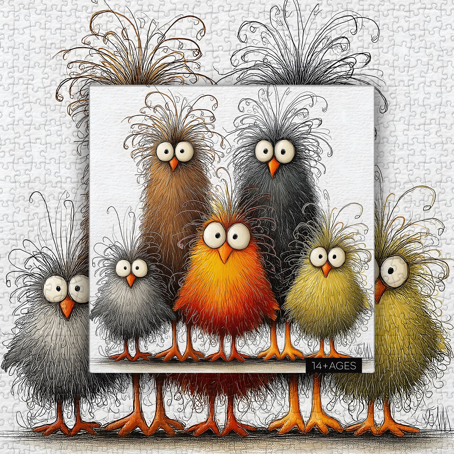 Appearance of Birds: The birds have exaggeratedly large, round eyes that give them a cute and funny look. Their feathers are fluffy and come in various colors like brown, black, orange, gray, and yellow. Each bird also has distinctive, curly crest feathers on their heads.
